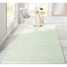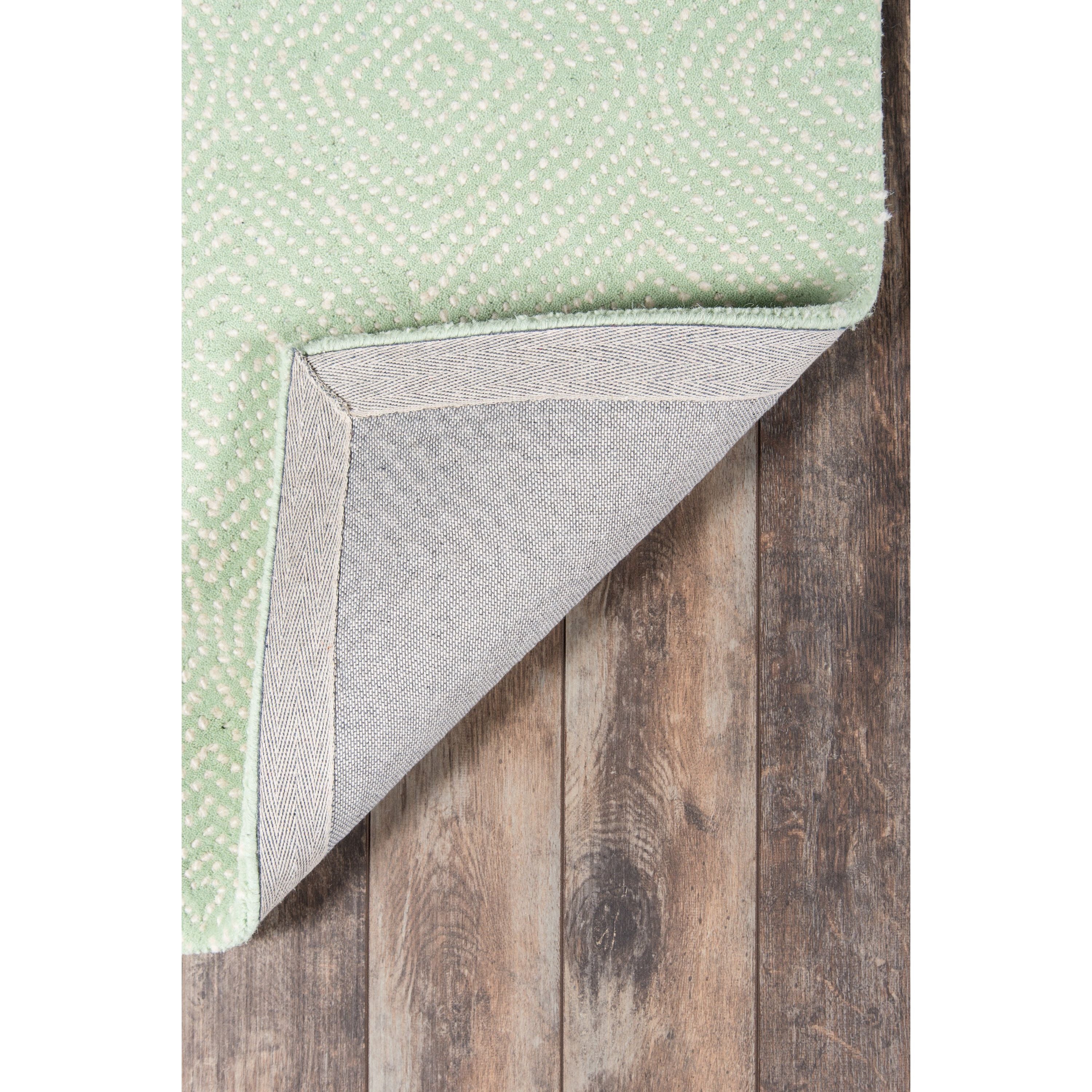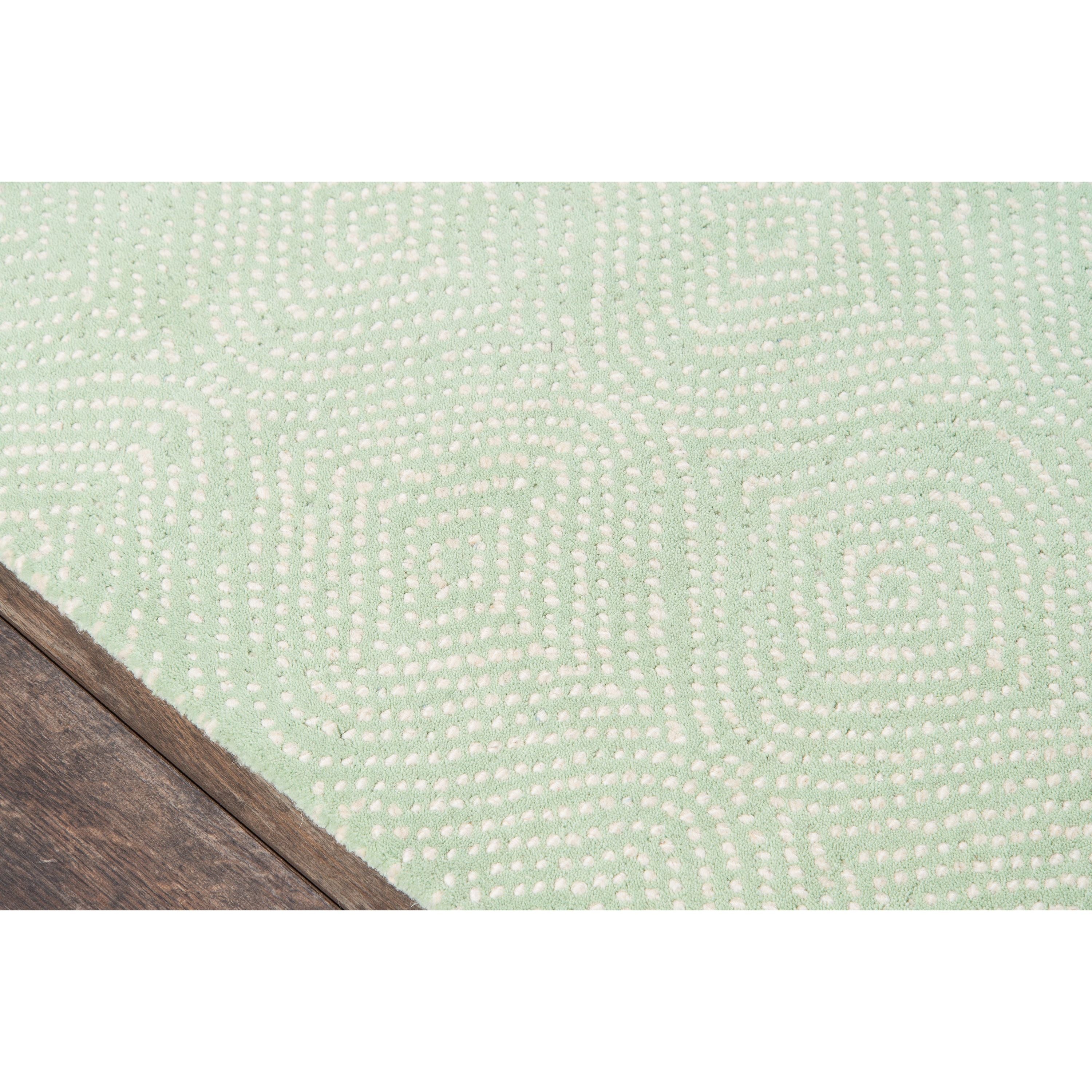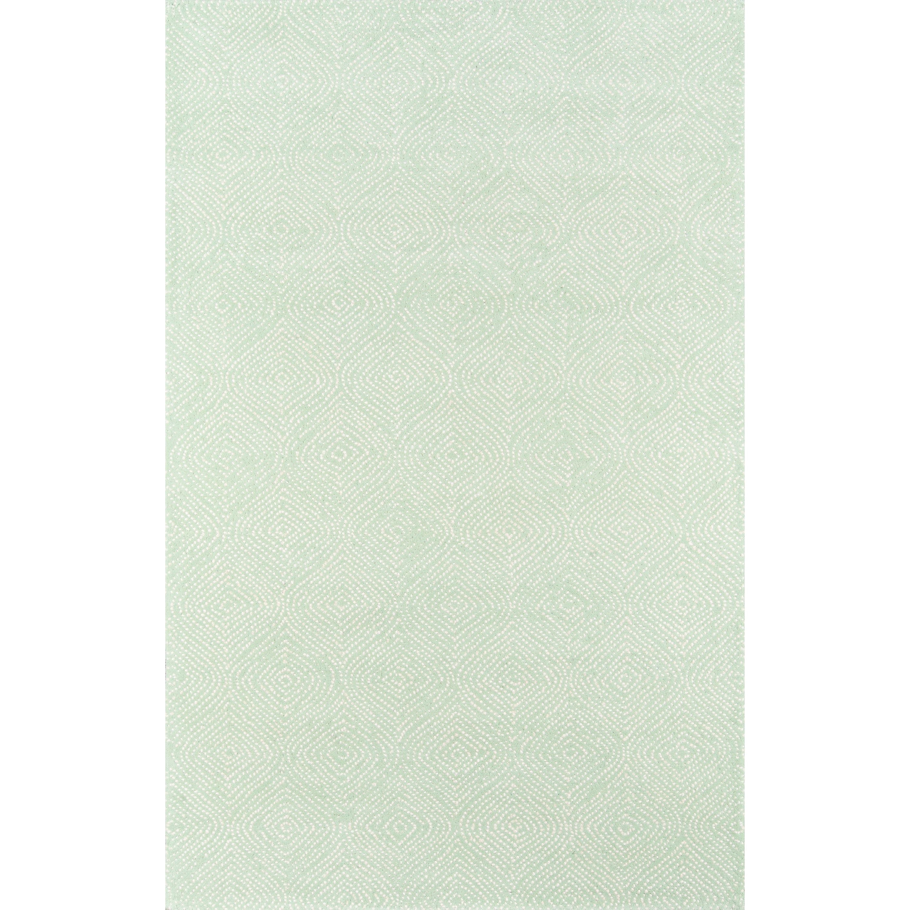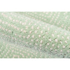 Roman Holiday Roh 1 Green, a classic and elegant area rug handcrafted from natural wool. The intricate design features soft dappled dots forming arabesque patterns in navy blue and pastel tones, creating a stunning visual effect that complements any decor style. Part of the Madcap Cottage by Momeni collection, this rug is luxuriously plush and showcases exceptional craftsmanship.