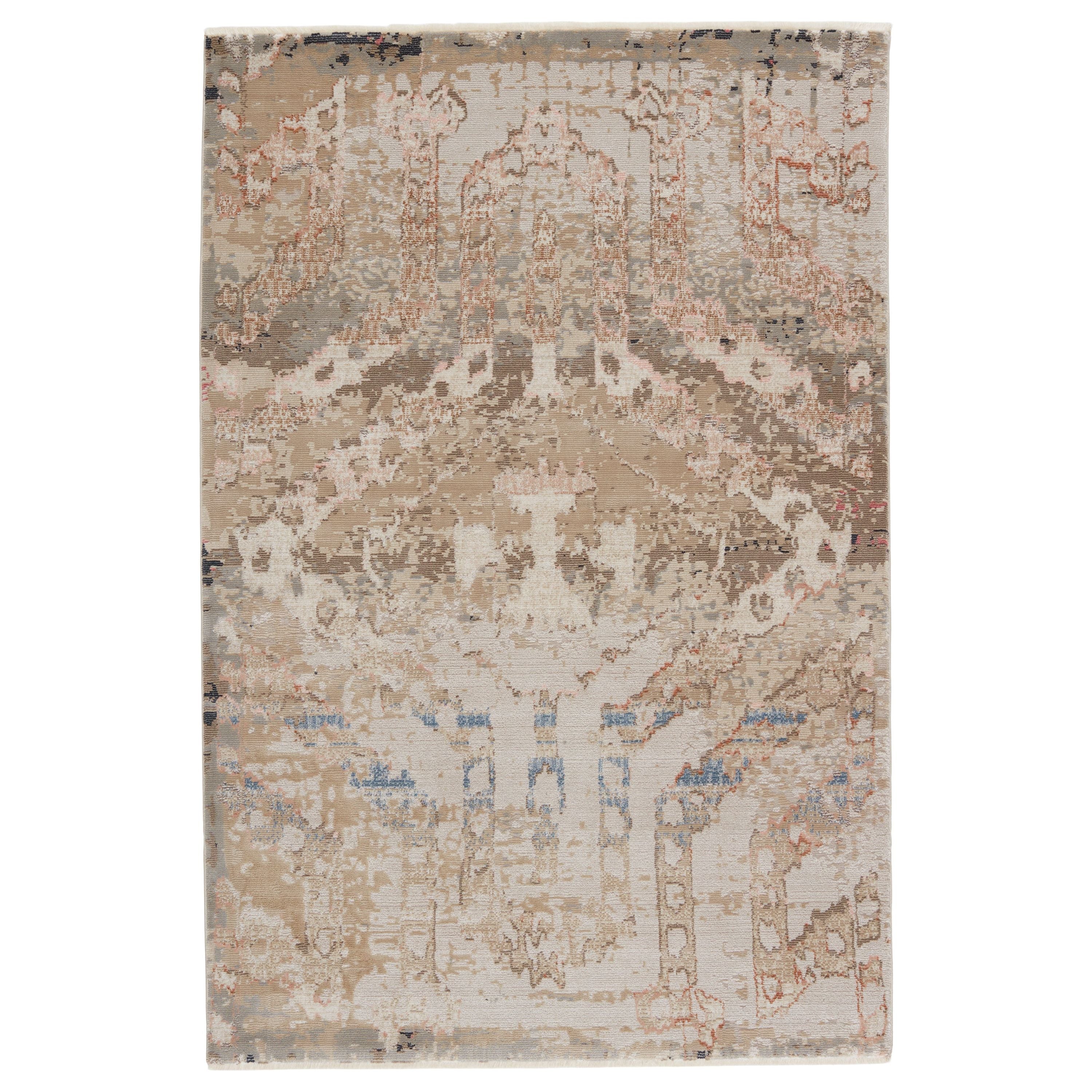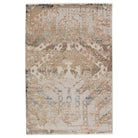 striking Sanaa By Nikki Chu SBC04 Yarden rug from the African-inspired collection by renowned designer Nikki Chu. This rug combines bold patterns with versatile color schemes, making it a standout piece for any decor. The Yarden rug features a beautifully distressed tribal design in a palette of tan, beige, taupe, and subtle hints of pink and blue. Its distinctive ivory fringe trim adds texture and a touch of vintage charm to your space.