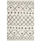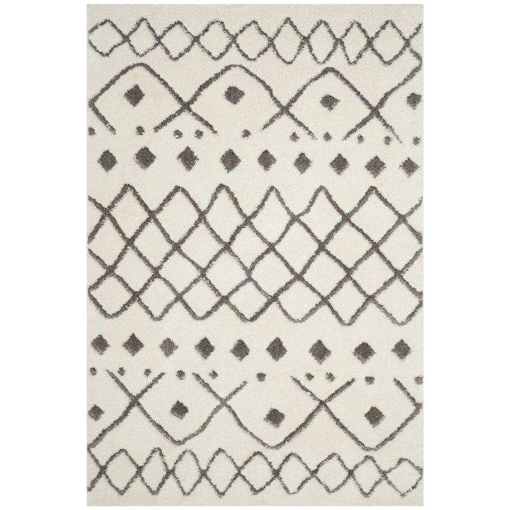 Sparta Shag SPG510C Ivory Grey rug, featuring intricate Moroccan-inspired geometric patterns expertly woven into its plush shag texture. The 1-inch pile height creates a luxurious feel and adds depth to any room, while also offering a soft and comfortable surface to walk on. Made from high-quality polyester fibers, this rug boasts a silky sheen that enhances its overall aesthetic appeal.