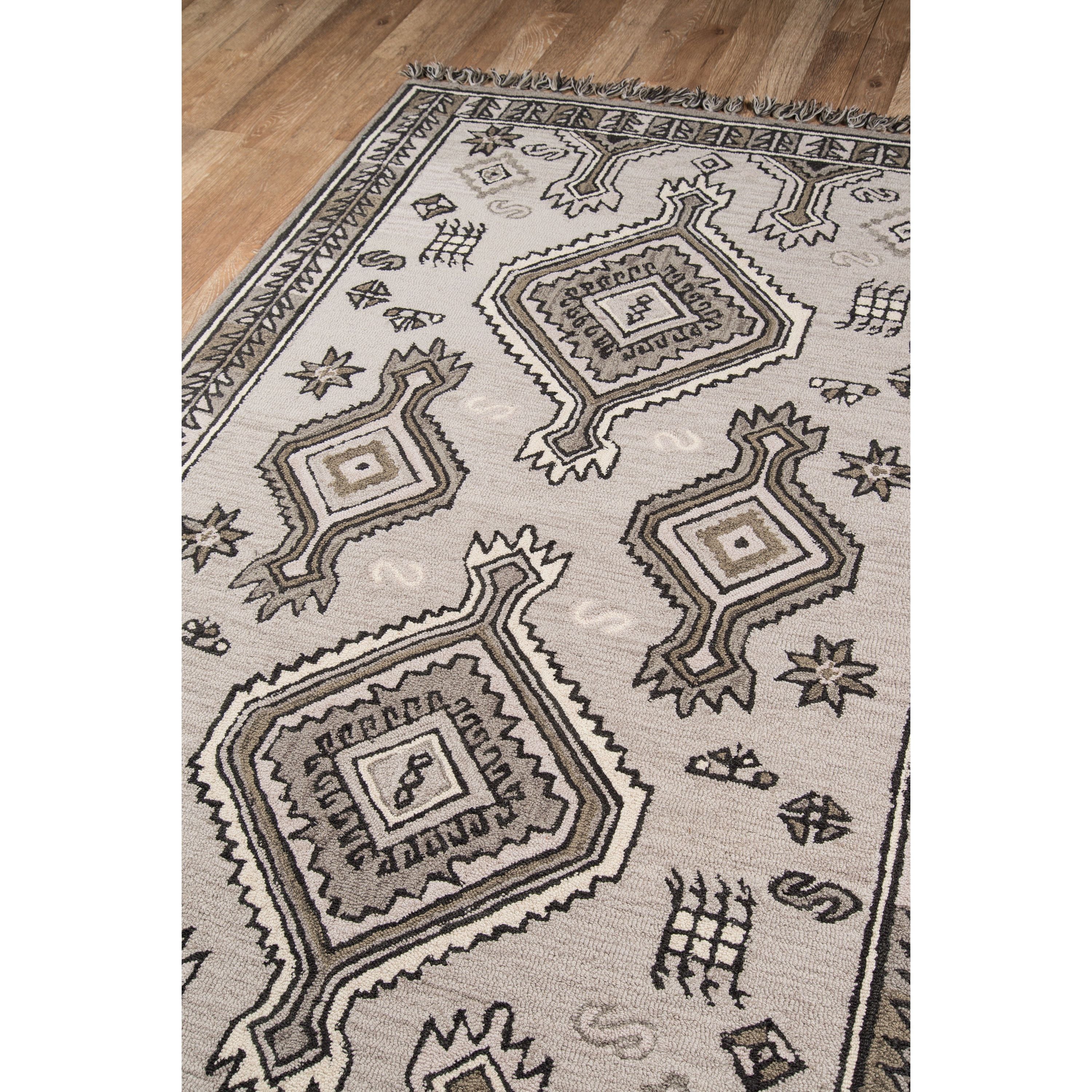 Tahoe Ta 03 Grey area rug, a fusion of Southwestern motifs with a contemporary twist. This decorative rug showcases a range of tribal patterns, each displaying a geometric repeat inspired by traditional tribal designs. The intricate linework features diamonds, crosses, medallions, and stars forming striking stripes across the rug. Adding to its exotic appeal are tassels at the top and bottom that emphasize the playful fringed border. Crafted from natural wool threads through hand hooking techniques, this rug stands out for its exceptional style and composition.