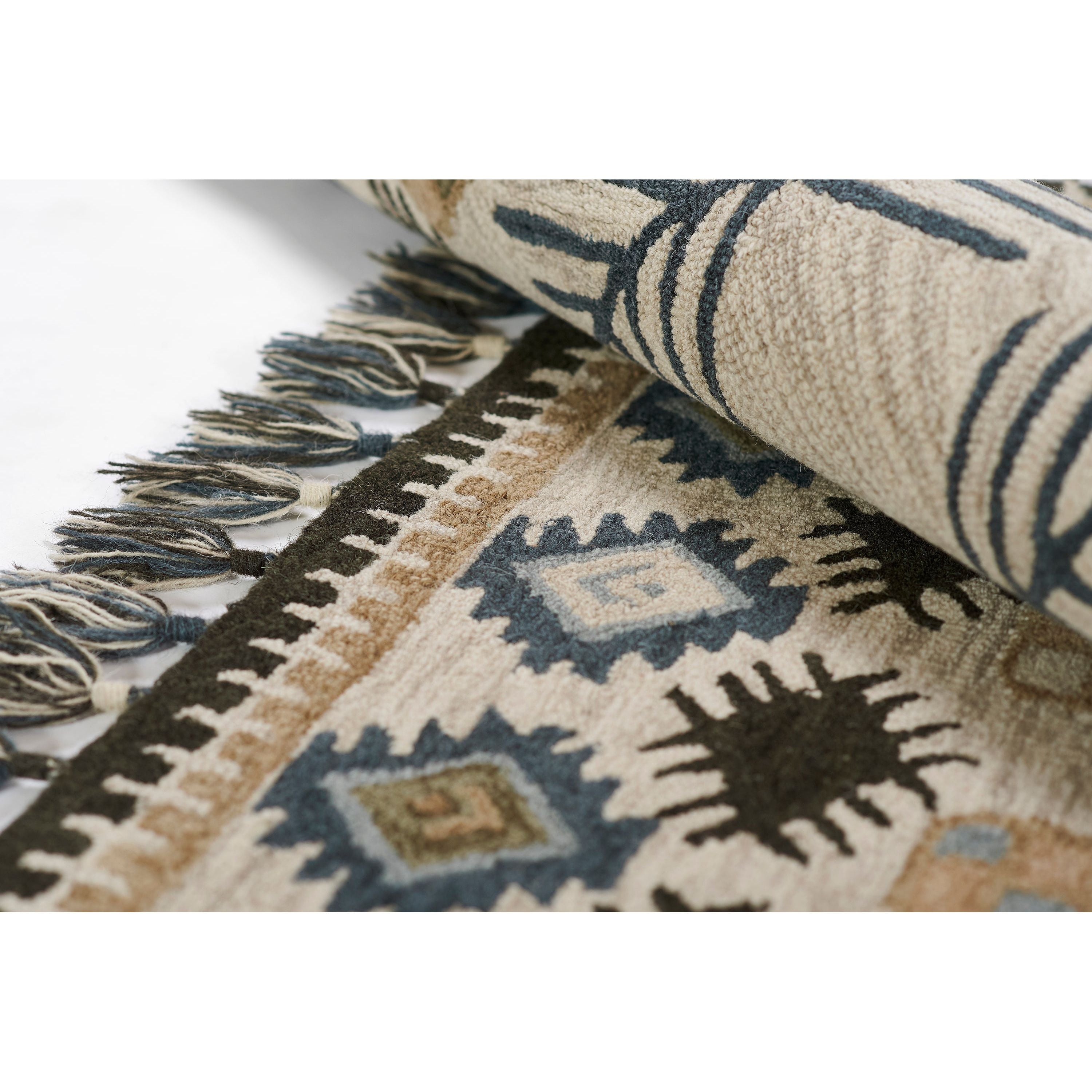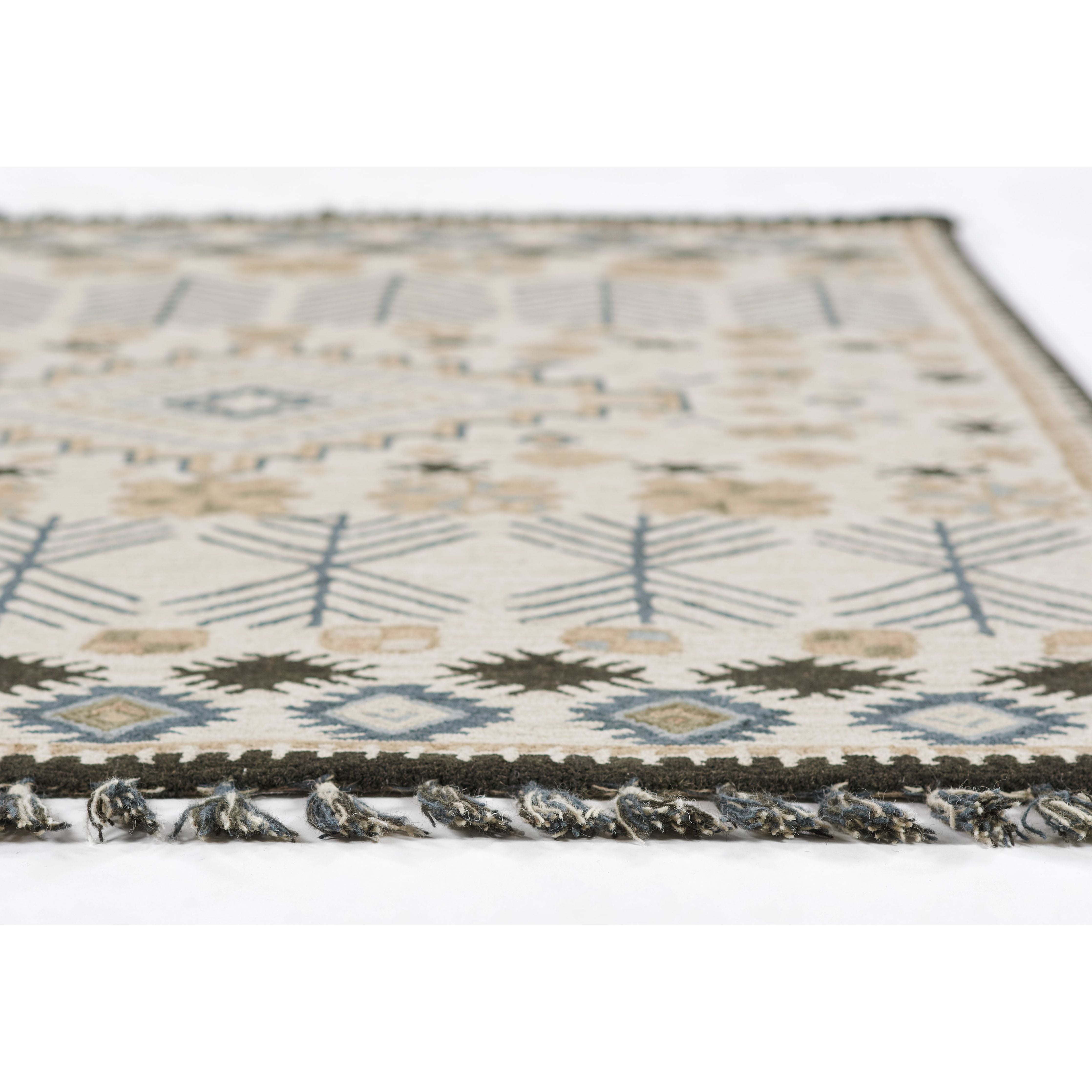 Tahoe Ta 04 Ivory rug, a modern twist on Southwestern motifs. This decorative area rug collection showcases a variety of tribal patterns, each featuring geometric repeats inspired by iconic tribal prints. From diamonds and crosses to medallions and stars, the designs create striking stripes and intricate linework. Tassels at the top and bottom of the rug add a playful touch, enhancing the exotic feel of the collection with a fun, fringed border. Crafted with exceptional style and composition, each rug is handmade to ensure quality and uniqueness.