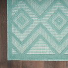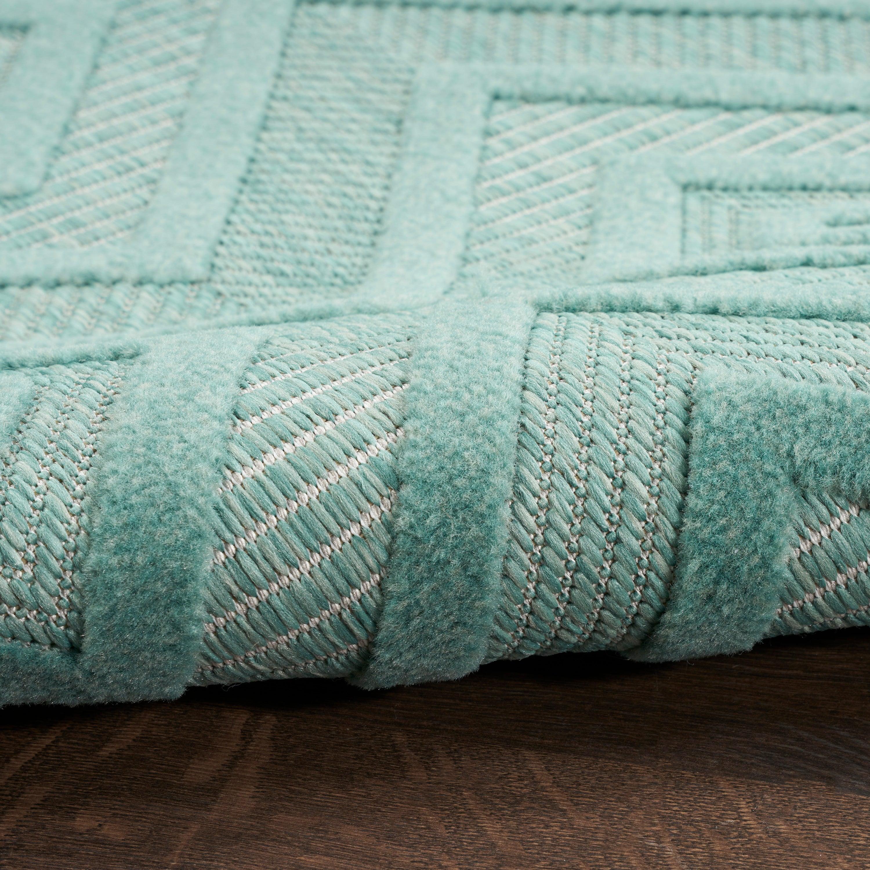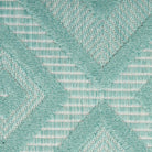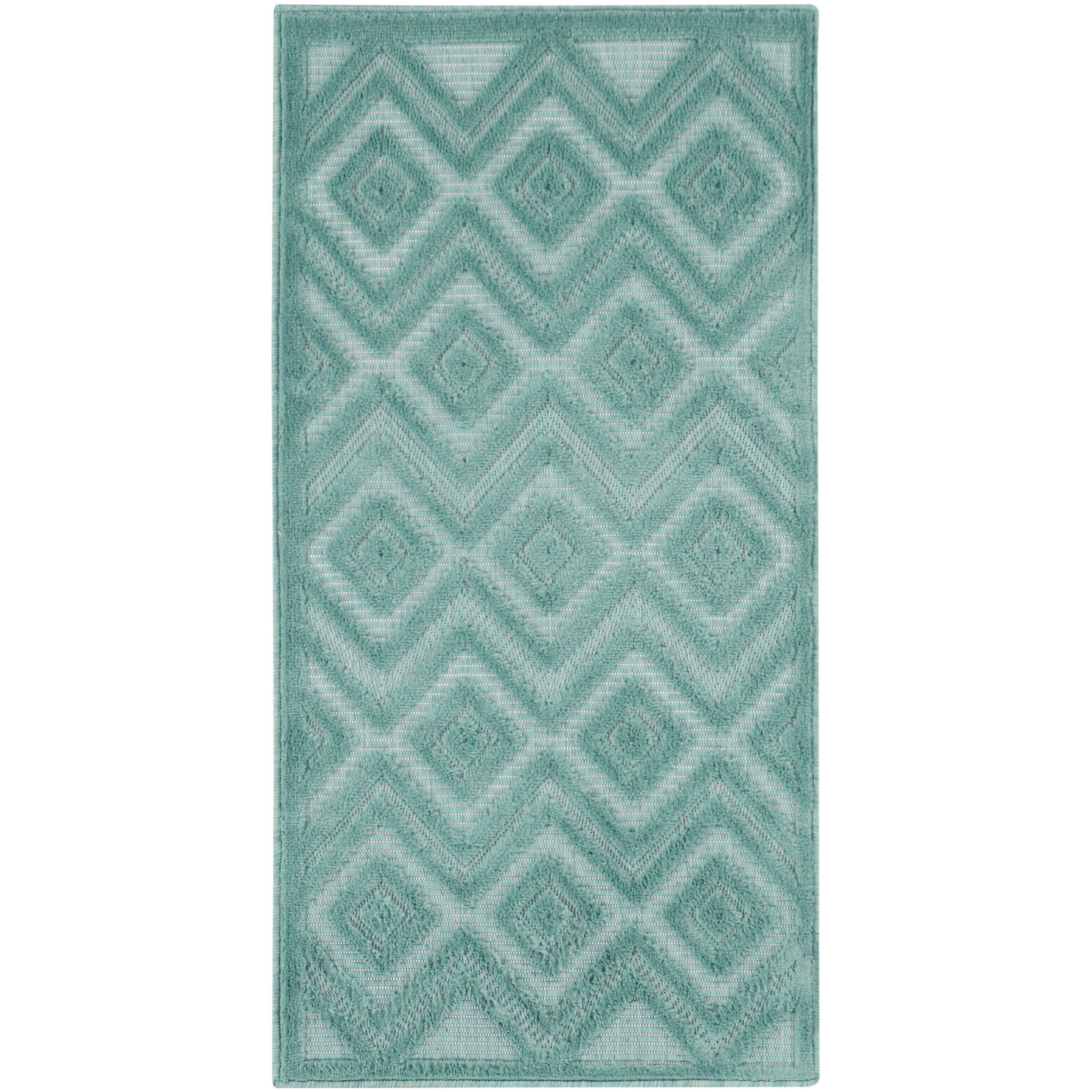 Versatile NRV01 Aqua Teal rug from the Nourison Versatile Collection. Elevate your indoor or outdoor area with this stunning aqua blue and teal rug featuring a raised diamond design that adds texture and modern charm. Crafted from durable, easy-to-clean fibers, this machine-made rug is perfect for high-traffic areas in your home and can withstand all seasons outdoors.
