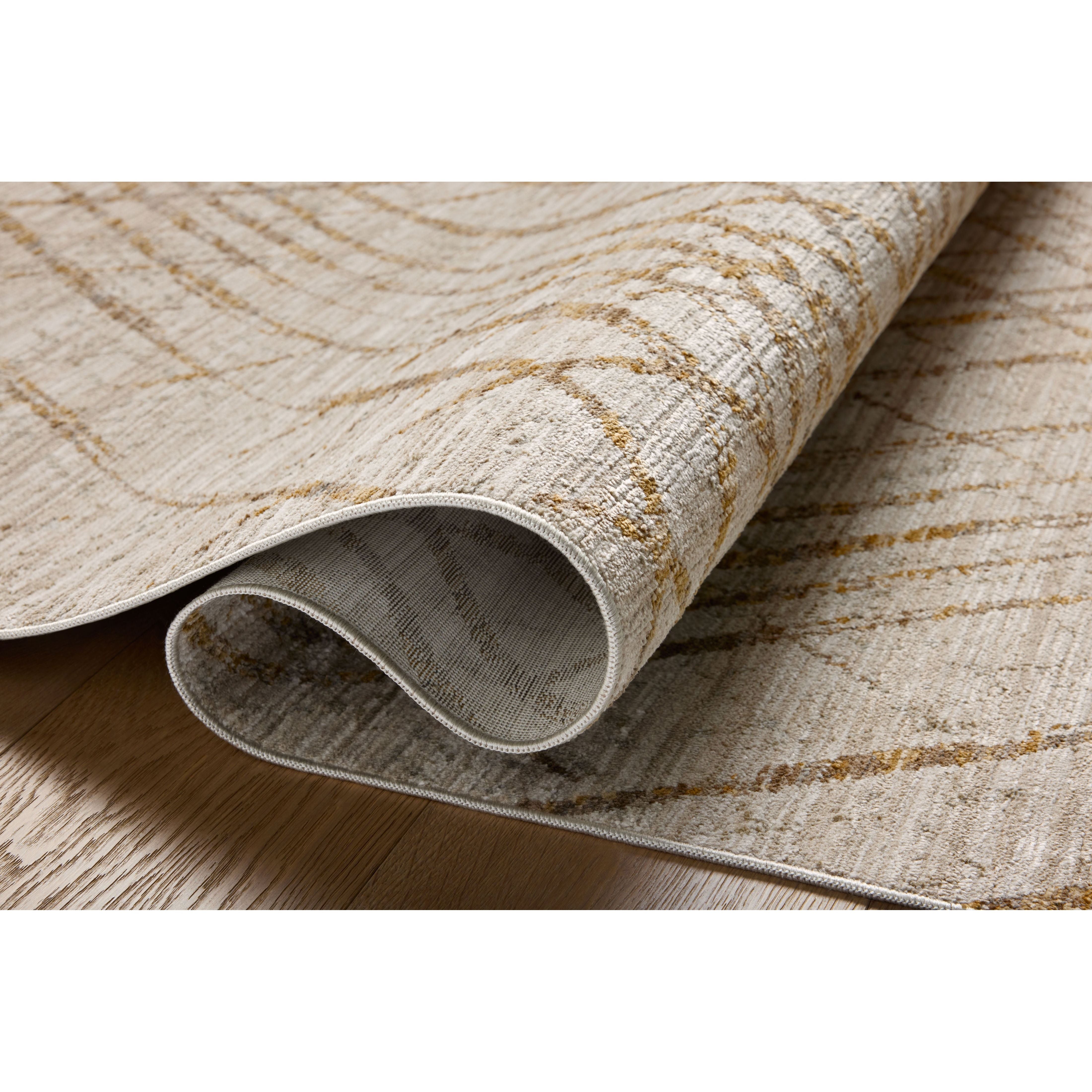 stylish Wade Wae 04 Beige Gold area rug from the exclusive Wade Collection. Crafted with a contemporary abstract design, this rug combines modern aesthetics with sturdy construction. Its power-loomed polyester material ensures durability, while the fringed edges add a touch of elegance. The deliberate distressing and linear motifs bring depth to the design, complemented by rich earth tones for a sophisticated look.